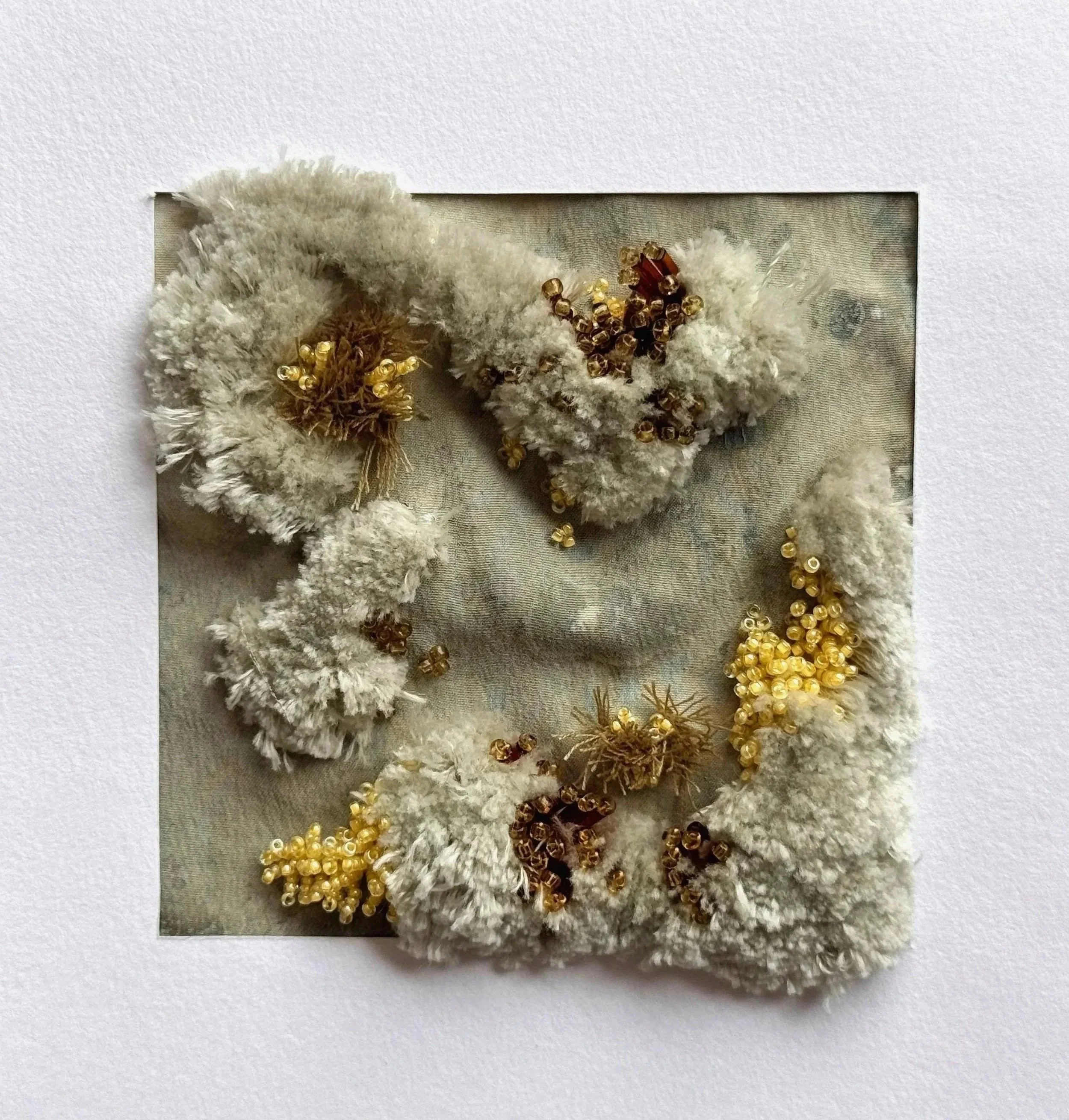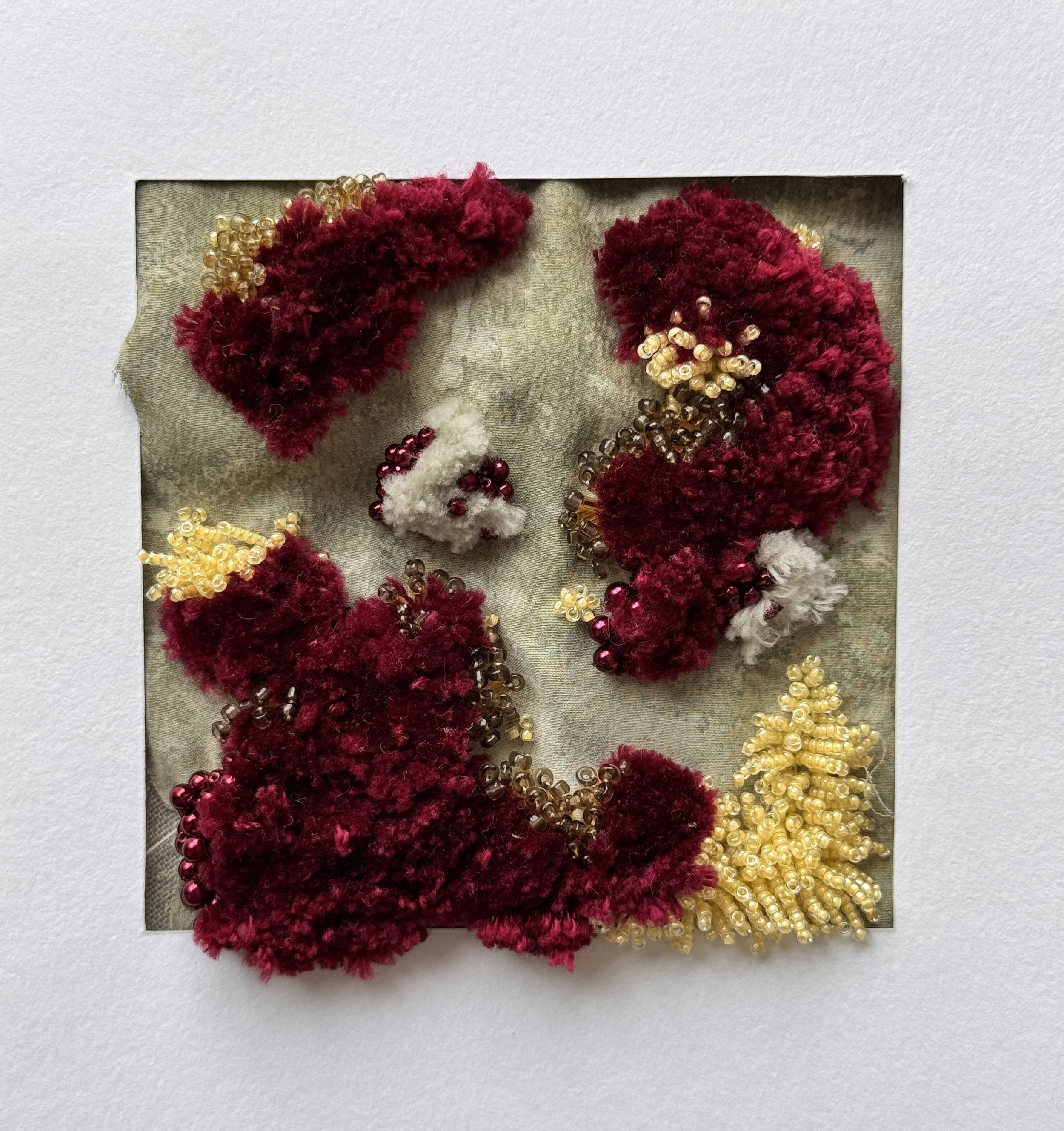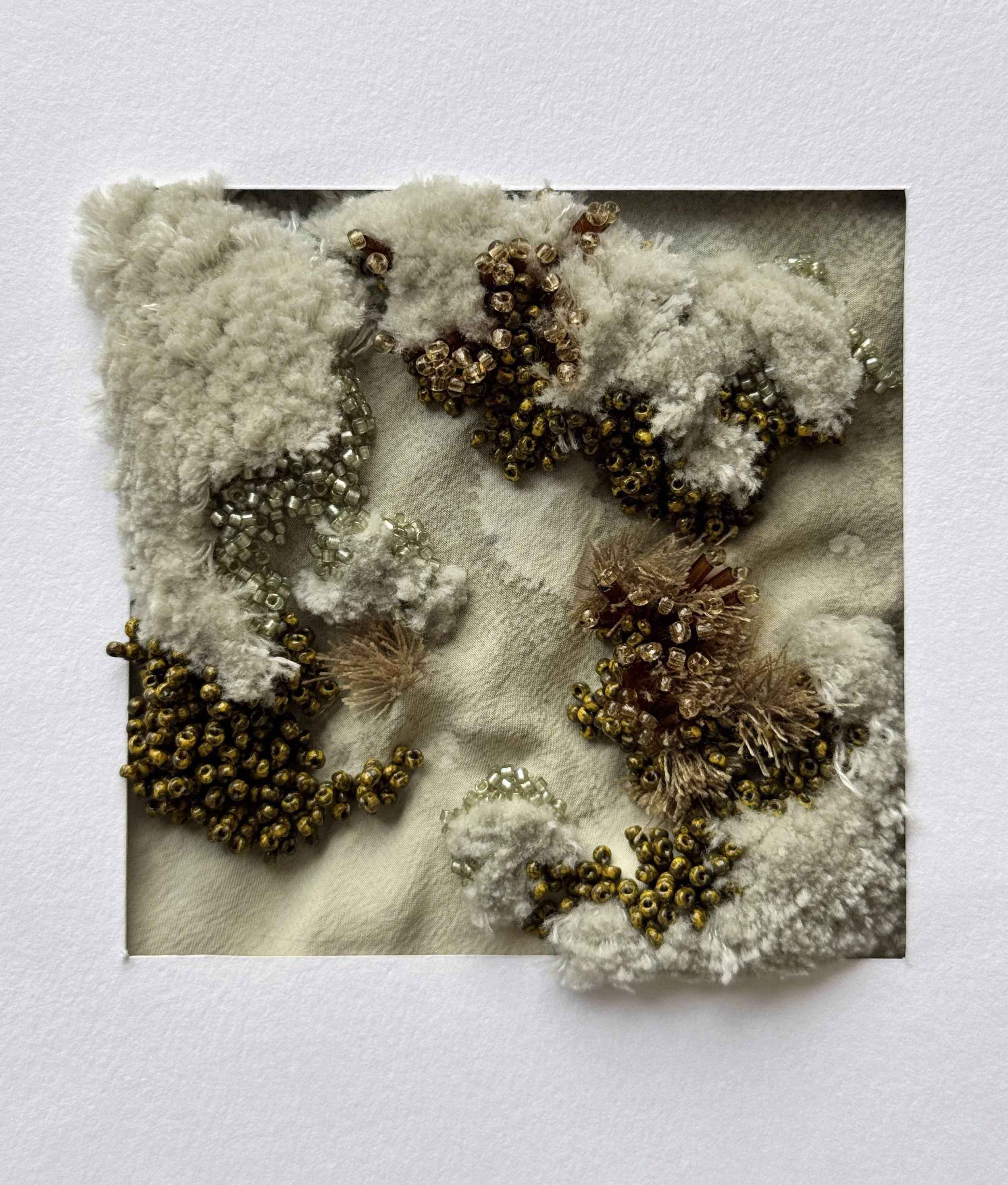 Working with fabric, embroidery and beading, the series focuses on building texture through slow, tactile processes. Threads are stitched and built upon to form dense clusters of colour, The restrained colour palette references organic tones found in the landscape, allowing material and texture to take precedence over pattern or narrative.