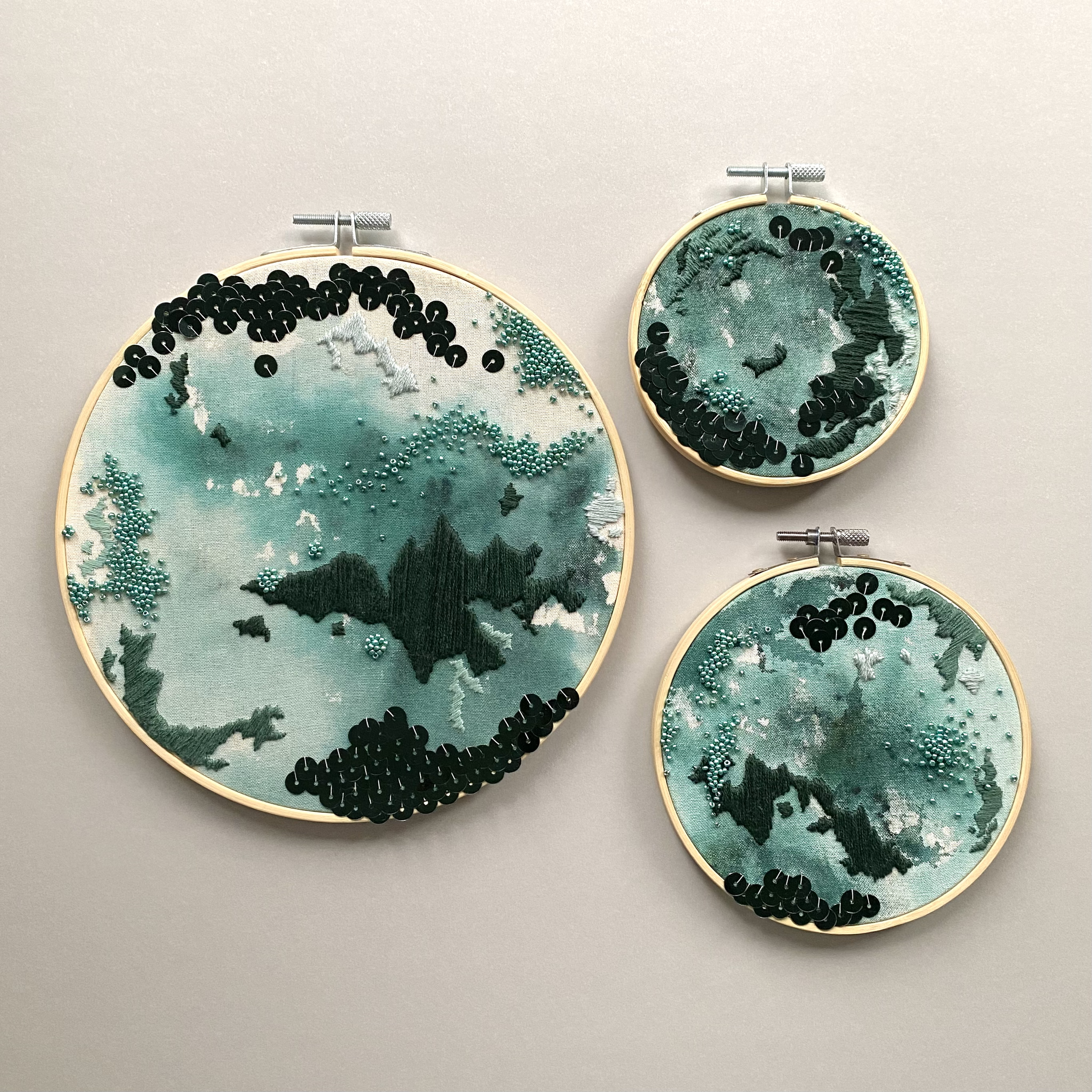 The circular format reinforces the sense of contained environments or cropped viewpoints, encouraging close inspection of material and detail. Rather than depicting specific underwater scenes, the series abstracts these influences, prioritising process, material exploration, and tactile engagement. Together, the works reflect an interest in surface design, slow making, and the translation of natural environments into textile form.