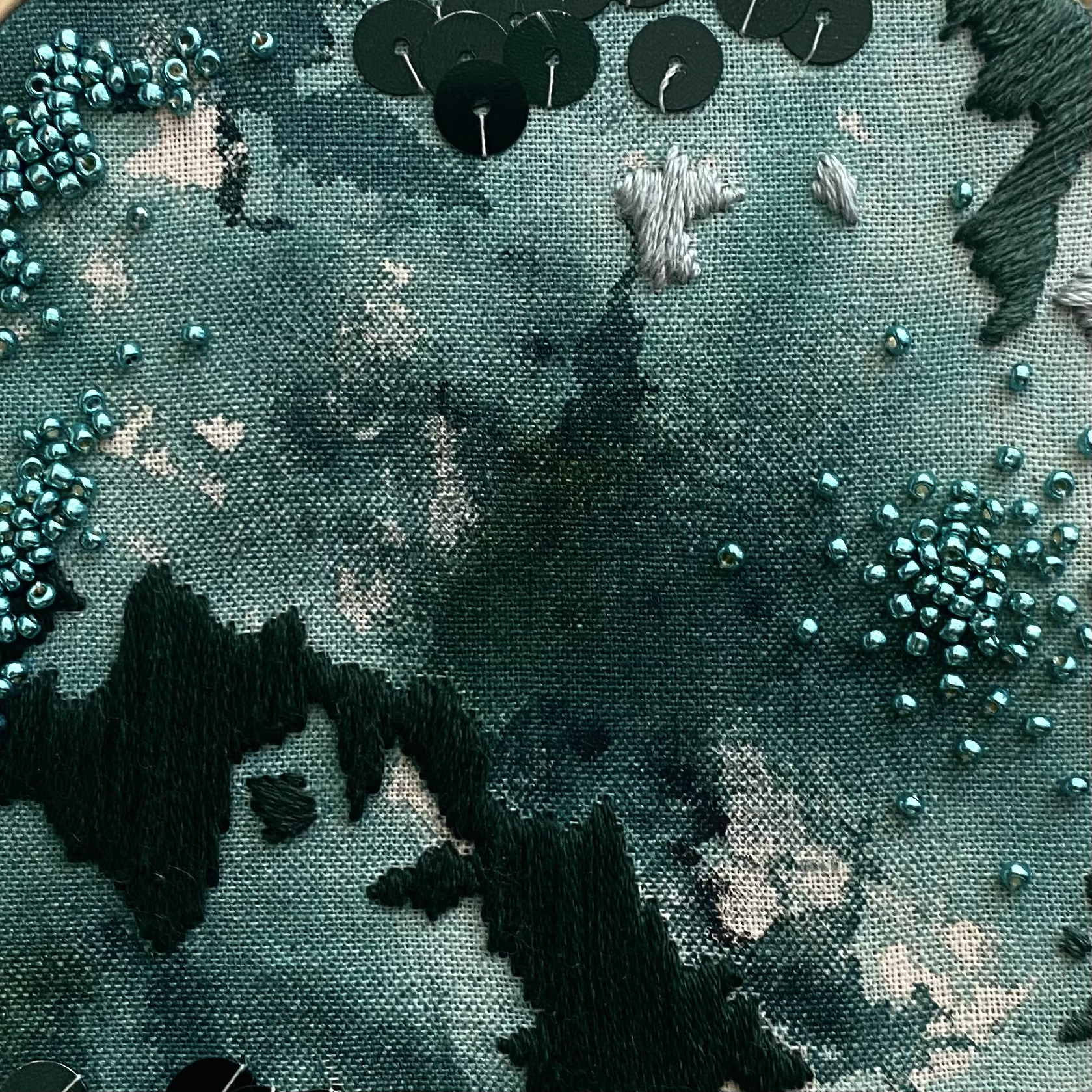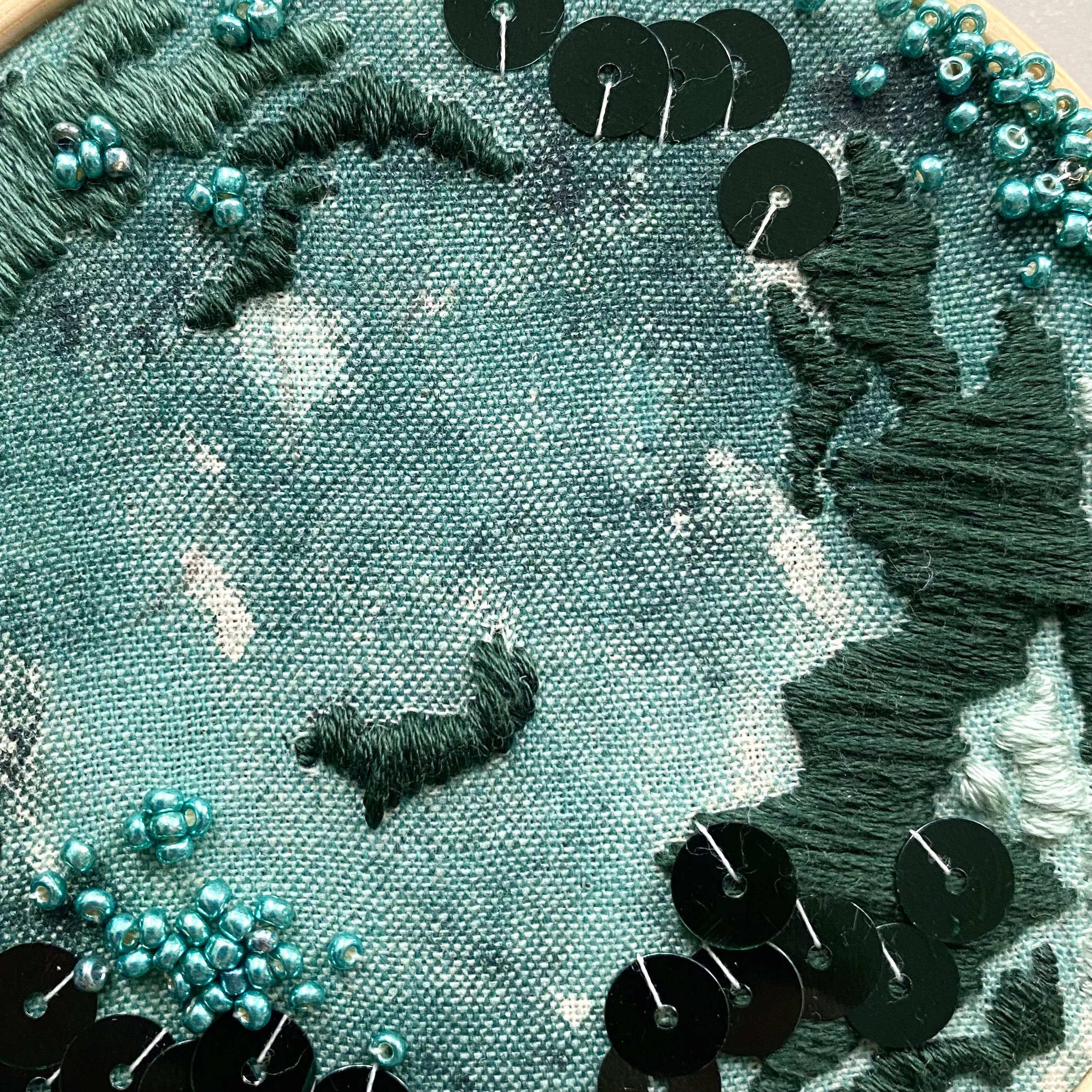 2020 | Pigment on unprimed cotton fabric, cotton thread, sequins, beads | 40cm x 40cm
